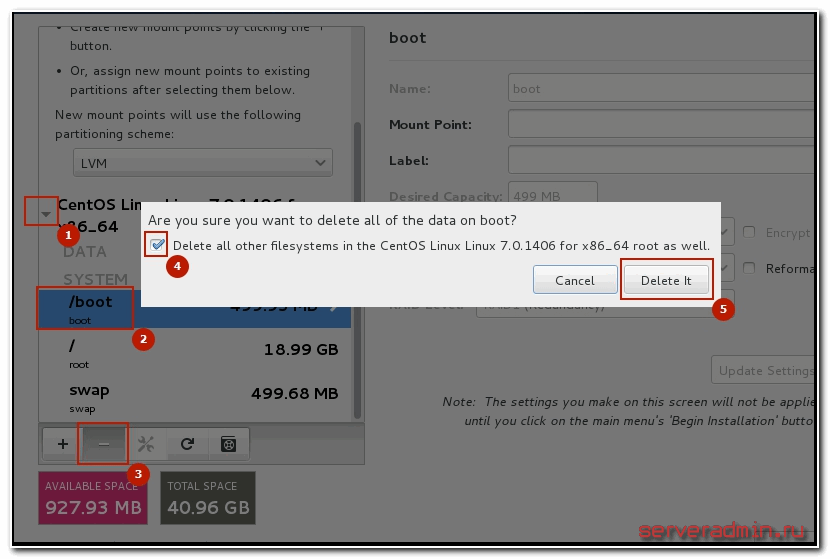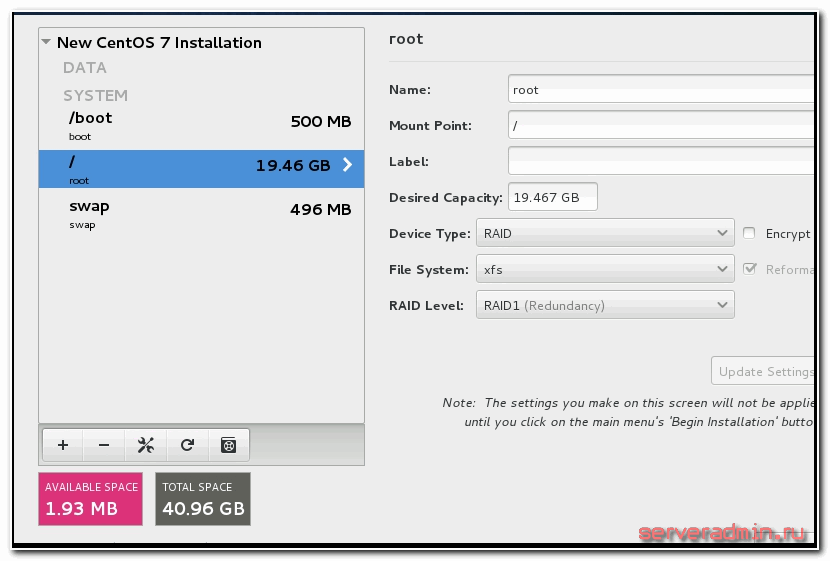 Все остальные параметры выставляем как было рассказано выше. Теперь можно начинать установку CentOS 7 на программный raid, который мы только что создали.