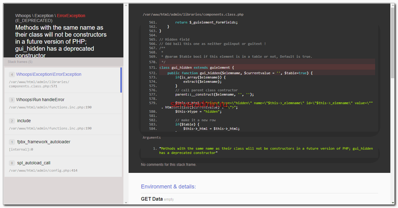 Whoops \ Exception \ ErrorException (E_DEPRECATED) Methods with the same name as their class will not be constructors in a future version of PHP; gui_hidden has a deprecated constructor in /var/www/html/admin/libraries/components.class.php on line 571