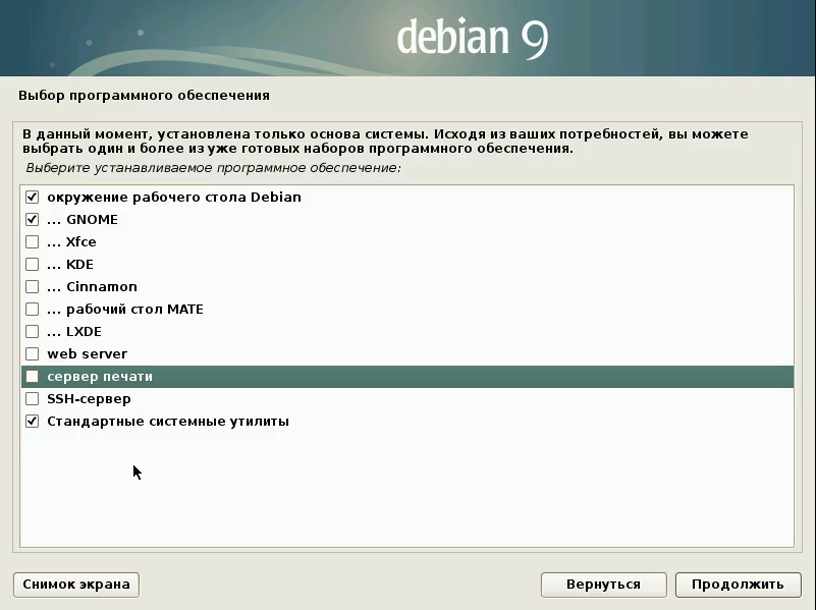 Далее, система спросит какое дополнительное программное обеспечение нужно установить. Сюда относятся различные сервисы и окружение рабочего стола: