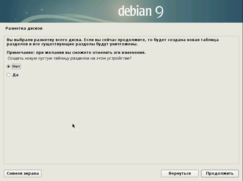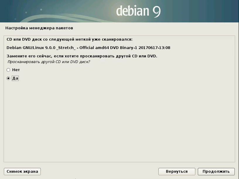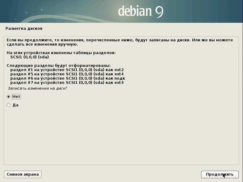 Последним шагом в процессе установки Debian на компьютер является установка загрузчика. Как и во множестве других дистрибутивов, в Debian используется GRUB2. Установщик просканирует диск и сообщит, что в данный момент Debian является единственной системой на нем, поэтому загрузчик можно установить в главную загрузочную запись. Выбираем пункт “Да” и жмем “Продолжить”: