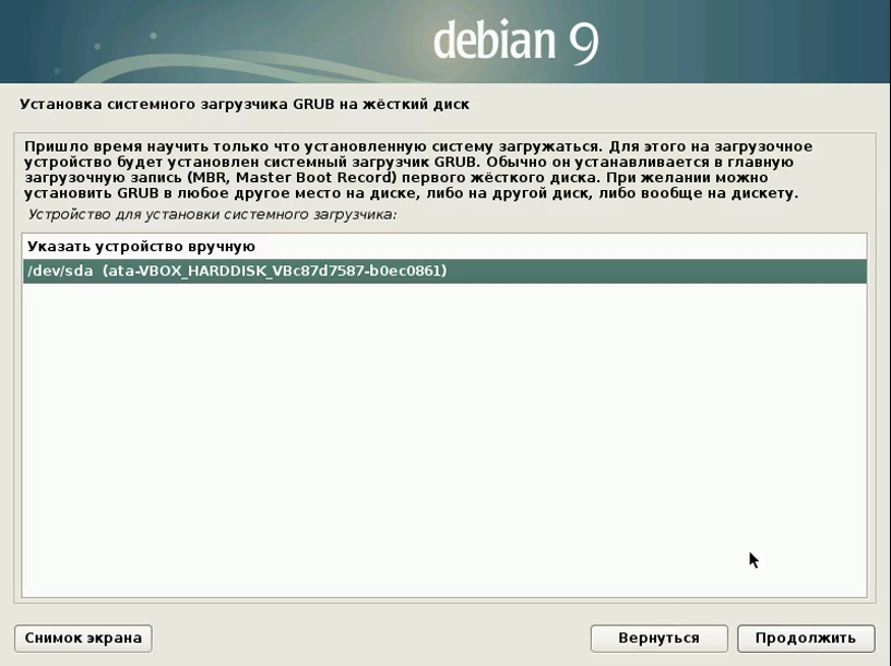 Теперь осталось выбрать конкретный носитель, куда GRUB2 и будет установлен. Если у вас нет никаких особых требований, выбираете ваш жесткий диск и жмете “Продолжить”: