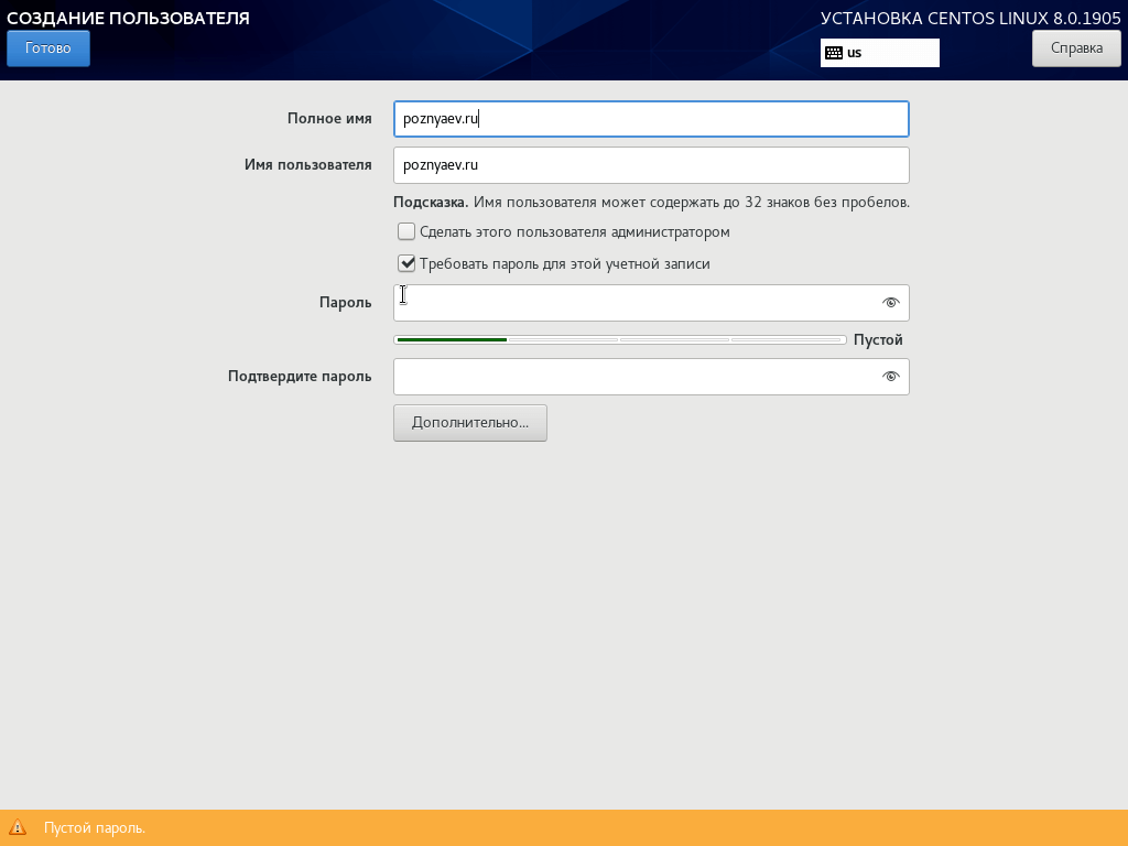 Мастер установки CentOS может решить, что пароль ненадежен. В нижней части окна на оранжевом фоне будет написано, почему установщик не рекомендует использовать этот пароль. В таком случае, если вы уверены в своем решении, нужно нажать на кнопку «Готово» два раза.
