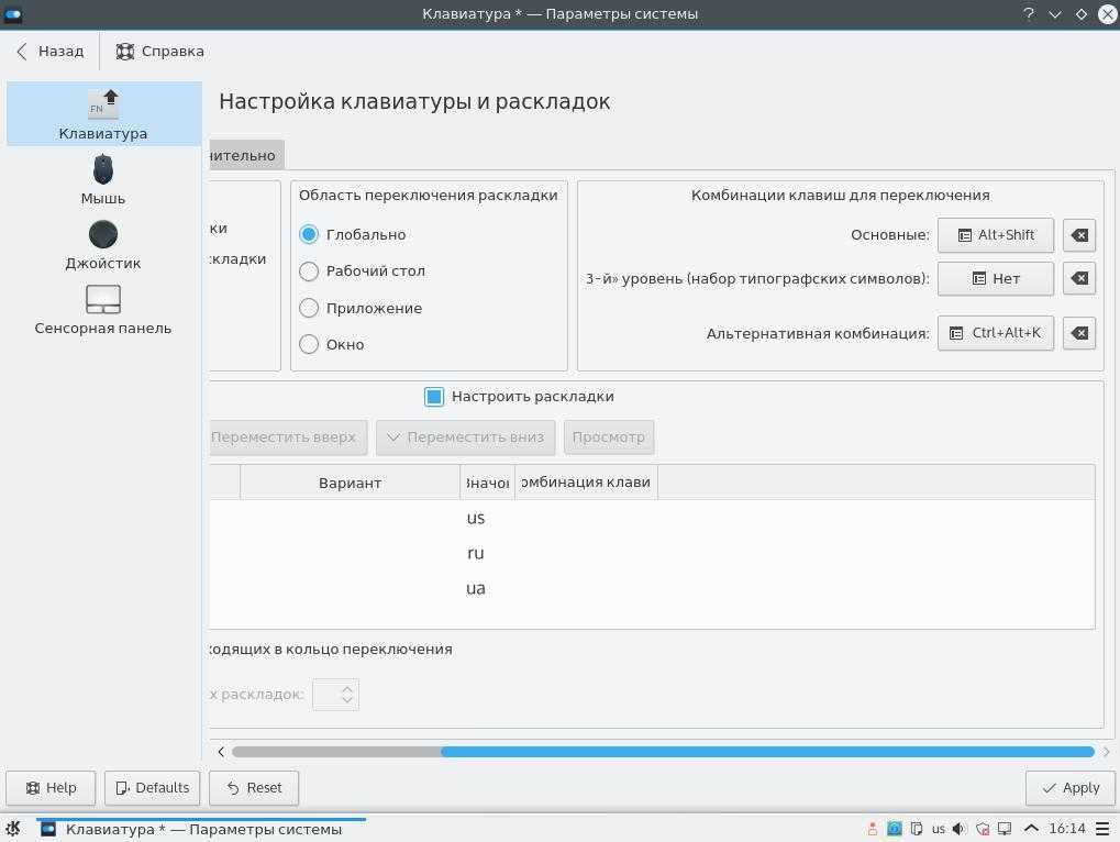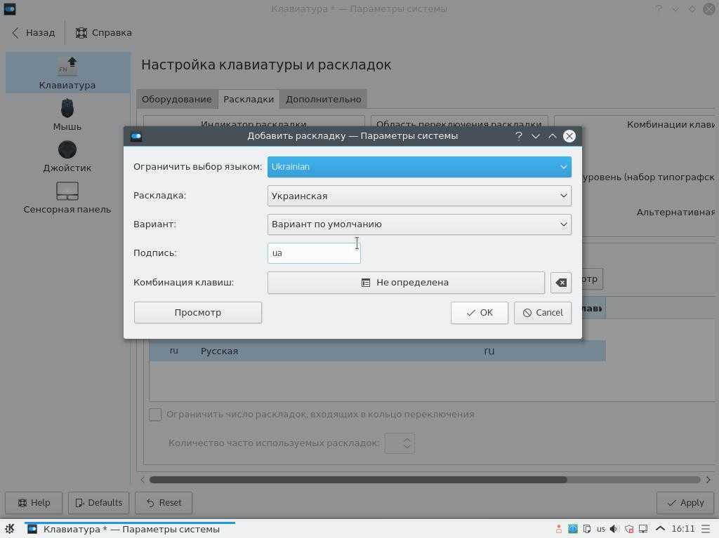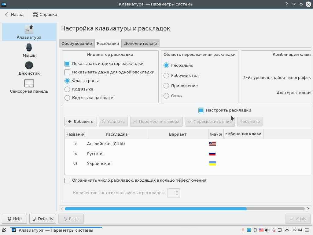 Это самое первое действие, с которым мы сталкиваемся после установки KDE. Ведь по умолчанию доступен только английский язык, и чтобы хоть что-то найти в интернете или сделать какую-либо запись на русском нужно настроить раскладку клавиатуры, переключение раскладки ну и как бонус индикатор раскладки на панели.