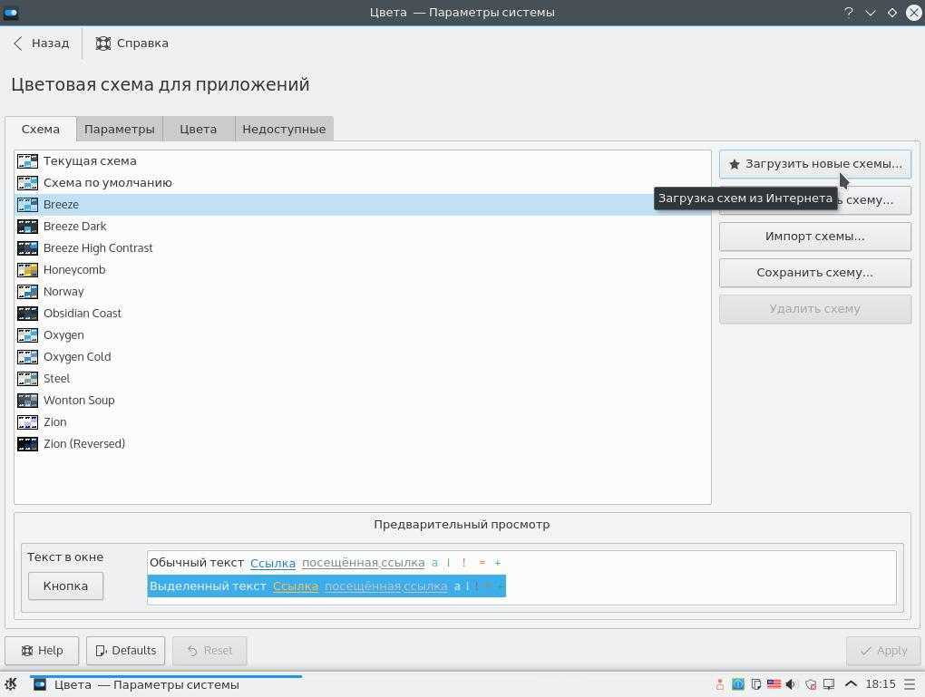 А раздел Значки позволяет выбрать тему значков для приложений, можно оставить новый, современный набор значков Breeze или, например, вернуть старый набор Oxygen также можно скачать дополнительные наборы значков из интернета: