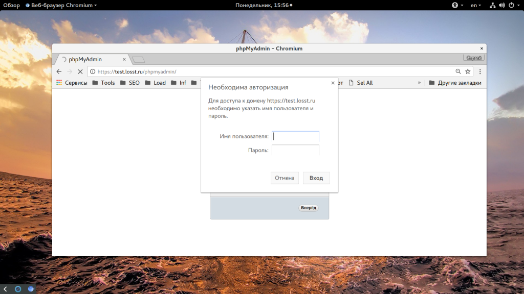 Теперь, как и в предыдущем варианте, при попытке открыть phpmyadmin вы увидите запрос пароля.