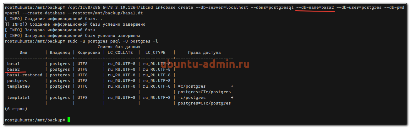 sudo /opt/1cv8/x86_64/8.3.19.1264/ibcmd infobase create --db-server=localhost --dbms=postgresql --db-name=basa2 --db-user=postgres --db-pwd=parol --create-database --restore=/mnt/backup/basa1.dt