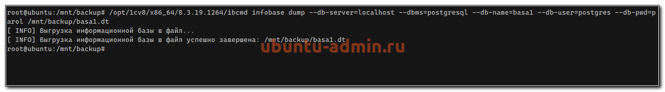 sudo /opt/1cv8/x86_64/8.3.19.1264/ibcmd infobase dump --db-server=localhost --dbms=postgresql --db-name=basa1 --db-user=postgres --db-pwd=parol /mnt/backup/basa1.dt