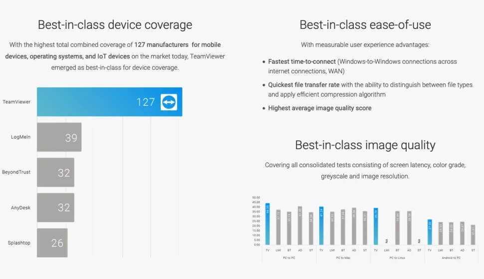 Все основные операционные системы поддерживают эти три продукта: Windows, Mac и Linux для настольных компьютеров, а также iOS и Android для мобильных телефонов. «AnyDesk» и «TeamViewer» также поддерживают Chromebook под управлением Chrome OS. Однако TeamViewer отличается тем, что он поддерживается 127 производителями операционных систем и устройств, включая мобильные устройства и Интернет вещей (IoT). Это выводит его вперед среди всех своих конкурентов, согласно исследованию, проведенному Qualitest — независимой компанией по обеспечению качества.