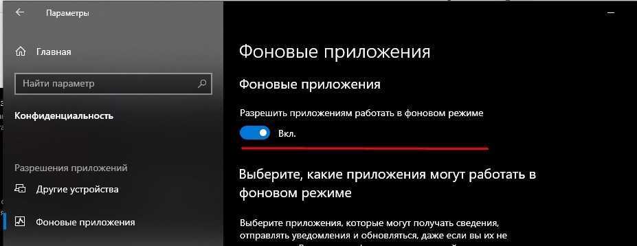 - отыскать строчку «Разрешать приложениям для Windows работать в фоновом режиме»;