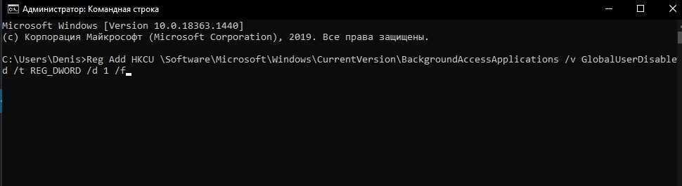 написать: «Reg Add HKCU \Software\Microsoft\Windows\CurrentVersion\BackgroundAccessApplications /v GlobalUserDisabled /t REG_DWORD /d 1 /f»;