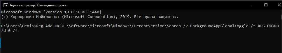 - ввести еще одну команду: «Reg Add HKCU \Software\Microsoft\Windows\CurrentVersion\Search /v BackgroundAppGlobalToggle /t REG_DWORD /d 0 /f»;
