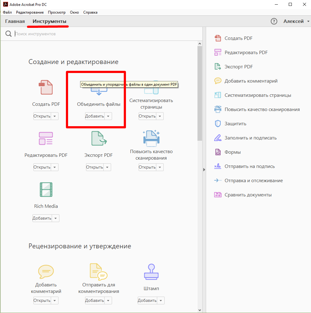 Переходим в «Инструменты» и здесь же нажимаем «Объединить файлы», далее все очень похоже на предыдущий пример с оналайн — сервисом: