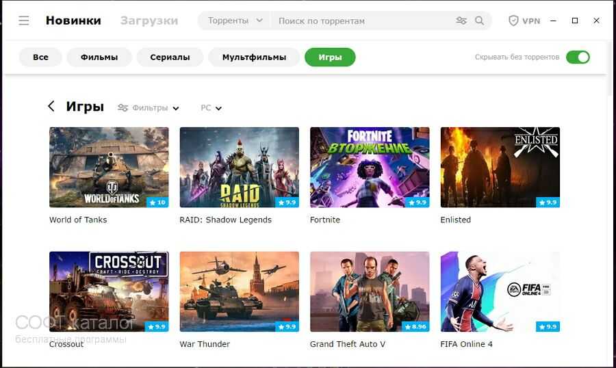Программа MediaGet совершенно бесплатно предоставляет пользователю доступ к своей удобно структурированной базе с невероятным количеством кинофильмов, музыкальных композиций, игр, программ, литературных произведений и прочего контента.