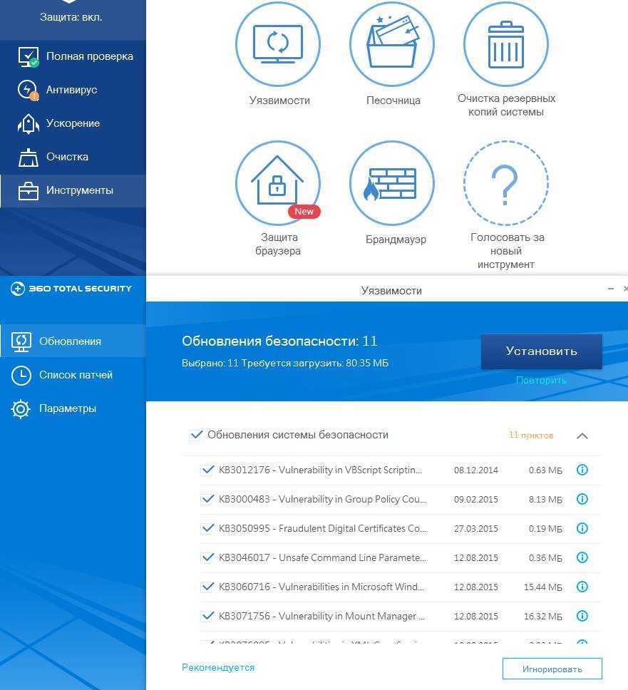 - Уязвимости — полезный сканер системных уязвимостей, позволяющий проверить наличие обновлений безопасности и различных патчей. Также есть возможность установить/удалить то или иное обновление (патч) безопасности.
