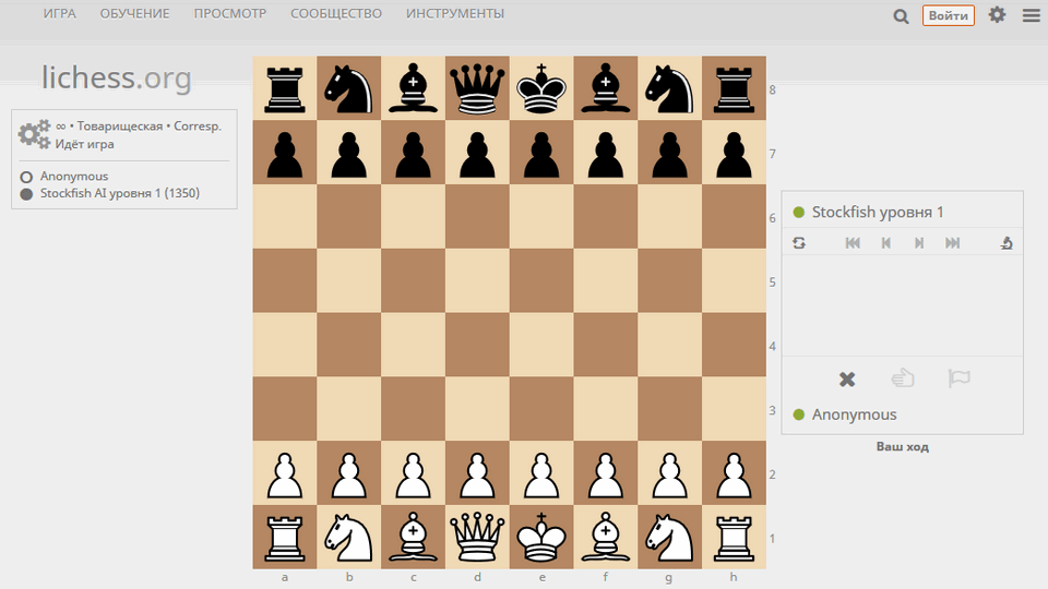 Если вы начинающий шахматист или вам просто хочется поиграть в шахматы, то я настоятельно рекомендую начать с бесплатного он-лайн ресурса https://lichess.org/ — это шахматный интернет-сервер, созданный французским программистом Тибо Дюплесси.