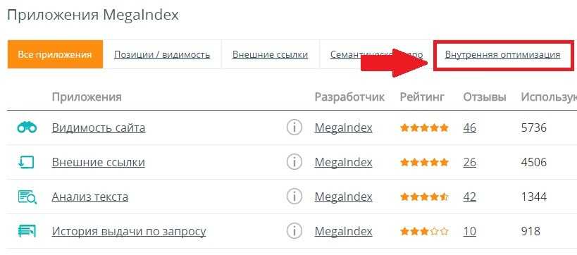 Способ 1. Считаем автоматически. Провести анализ и вычислить нужное количество знаков поможет сайт Мегаиндекс. Зарегистрируйтесь и перейдите в раздел внутренней оптимизации.