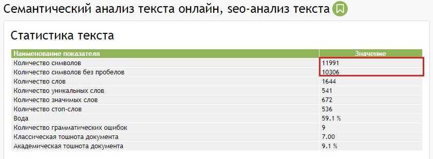 Сервис подсчитает количество слов и символов в тексте, а заодно проведет сео-анализ вашей статьи. Например, покажет % воды в тексте – соотношение не несущих смысловой нагрузки стоп-слов, фраз, речевых оборотов к их общему количеству. Чем выше этот показатель, тем бесполезнее поисковый робот считает статью и понижает ее в выдаче.