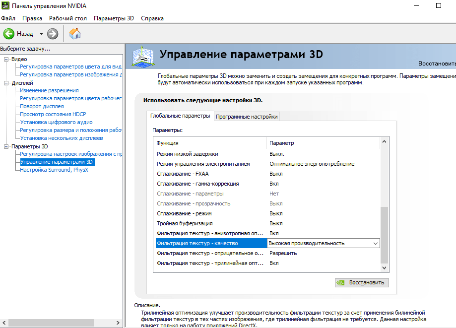 Затем отправляйтесь в «Управление параметрами 3D». Уберите «Сглаживание» и поставьте «Высокая производительность» в окне «Фильтрация текстур — качество».