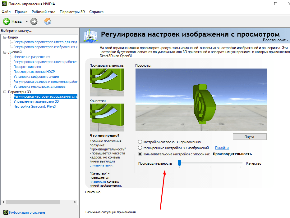 Обратите внимание на «Параметры 3D»: перейдя туда жмите на «Регулировка настроек изображения». После этого перейдите на «Пользовательские настройки с упором на» и потяните ползунок в сторону максимальной производительности