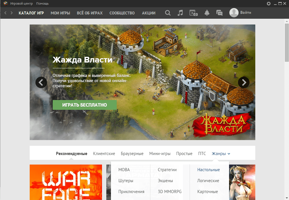 Игровой сервис от отечественного IT-гиганта сумел приятно удивить. В программе присутствует довольно большой выбор игр самых разных жанров. Не может не радовать тот факт, что все они бесплатны, либо распространяются по системе Free2Play. Несомненно, это привлекает довольно обширную публику.