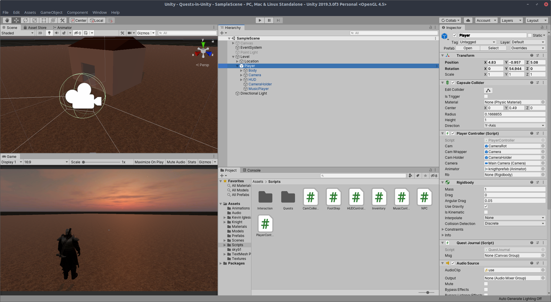 Дальше можно увидеть иерархию объектов на сцене, файловый менеджер и вкладку Inspector — в ней есть разные настройки для выбранного объекта. Кроме того, можно зайти в настройки проекта и указать желаемые показатели для гравитации, освещения, теней, качества графики и всего прочего.