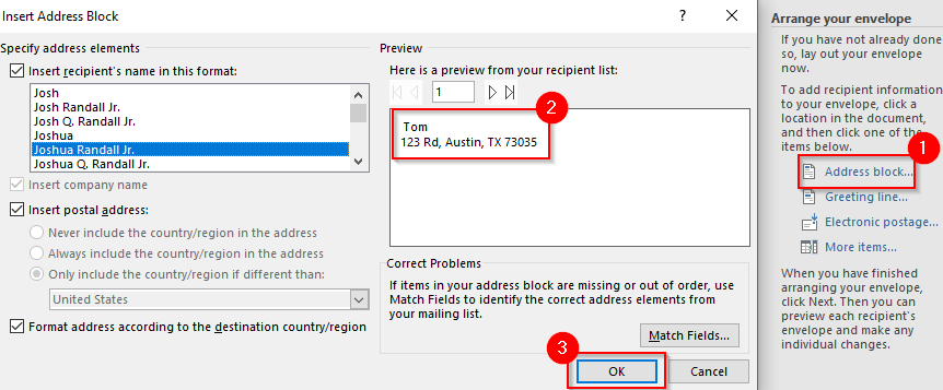 - На следующем экране выберите Блок адреса, посмотрите на предварительный просмотр, чтобы убедиться, что он выглядит так, как вы хотите, и нажмите ОК.
