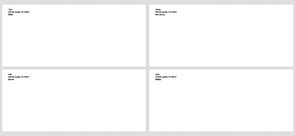 Word изменит макет страницы в соответствии с параметрами печати конверта, добавив адреса на каждой странице. Если вас устраивает дизайн, нажмите Файл> Печать> Печать чтобы начать процесс печати.