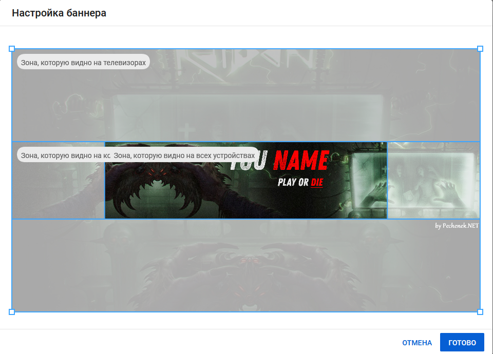 Важно учитывать не только общий размер картинки, но и размер области, на которой будет расположен текст и основные изображения. YouTube обрезает баннер на небольших устройствах: если близко к краю изображения есть какие-то надписи, на смартфоне их будет не видно
