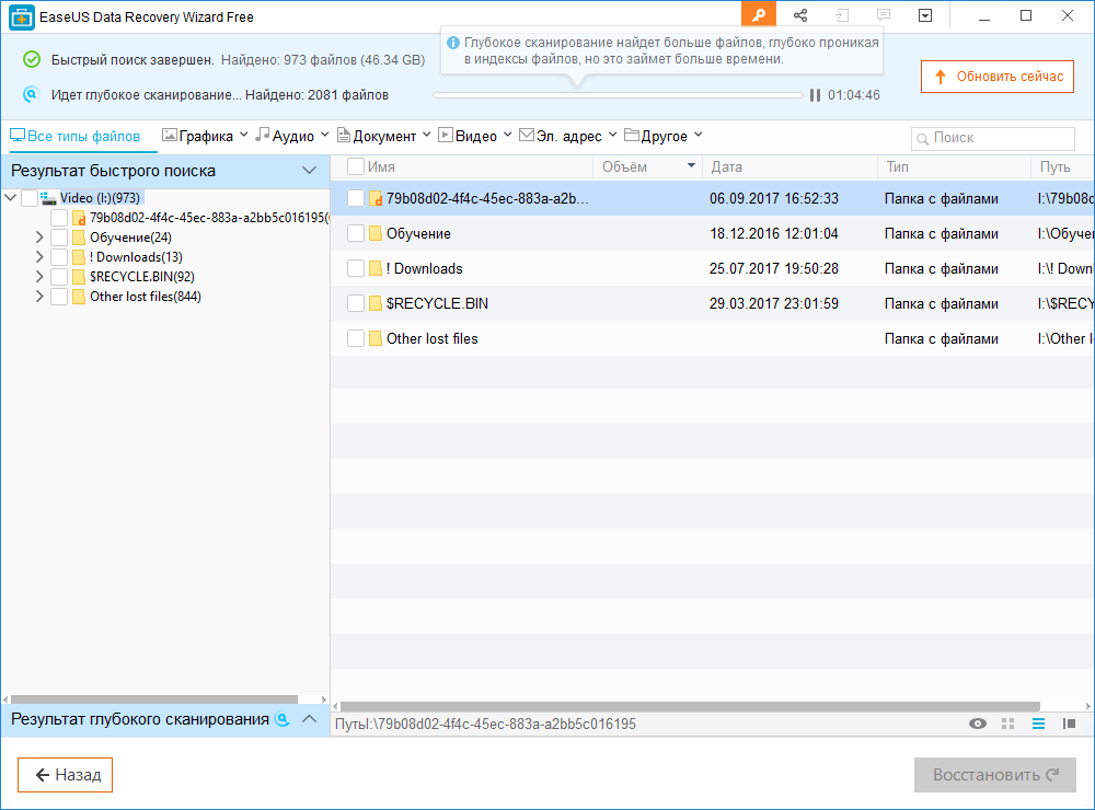 Программа от EaseUS просканирует указанный диск полностью и представит вам всю потерянную информацию (включая скрытые файлы).