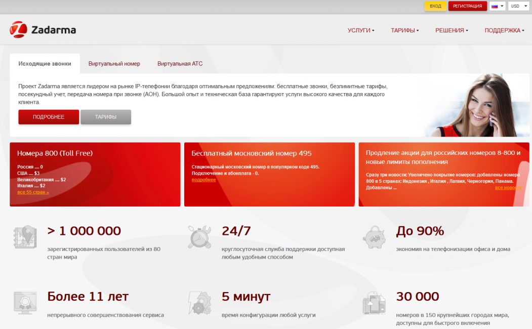 Zadarma.com — русскоязычный сайт для совершения бесплатных звонков. Его интерфейс выглядит следующим образом: