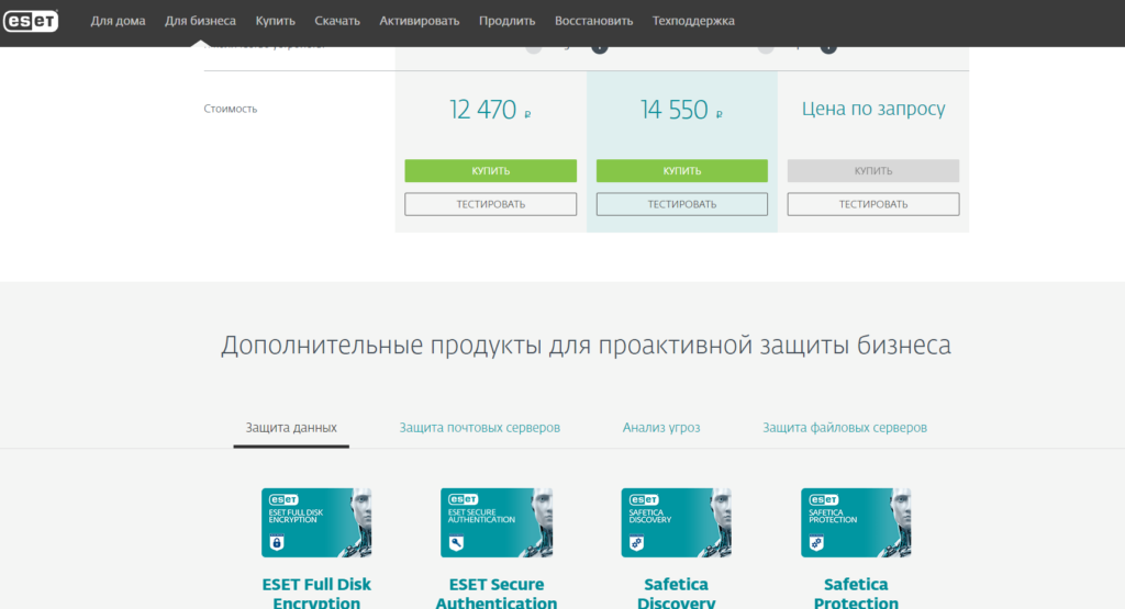 А вот тут все куда интереснее. В среднем ESET стоит около 800 рублей для мобильной защиты и защиты Smart TV на телевизорах, лучшие модели которых вы можете найти здесь. И от 1500 до 2500 рублей за полноценную домашнюю защиту. А вот бизнес-версии антивирусов стоят от 12 500 до 15 000 рублей. Кроме того, ряд программ предлагается «по запросу». Скорее всего это значит, что цена будет индивидуальной для каждого покупателя.