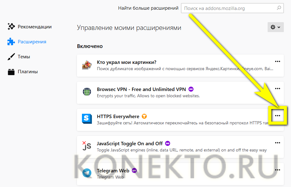На вкладке «Расширения» — найти предположительно послуживший источником проблемы «Ваше соединение не защищено» плагин, кликнуть по размещённым справа трём точкам.