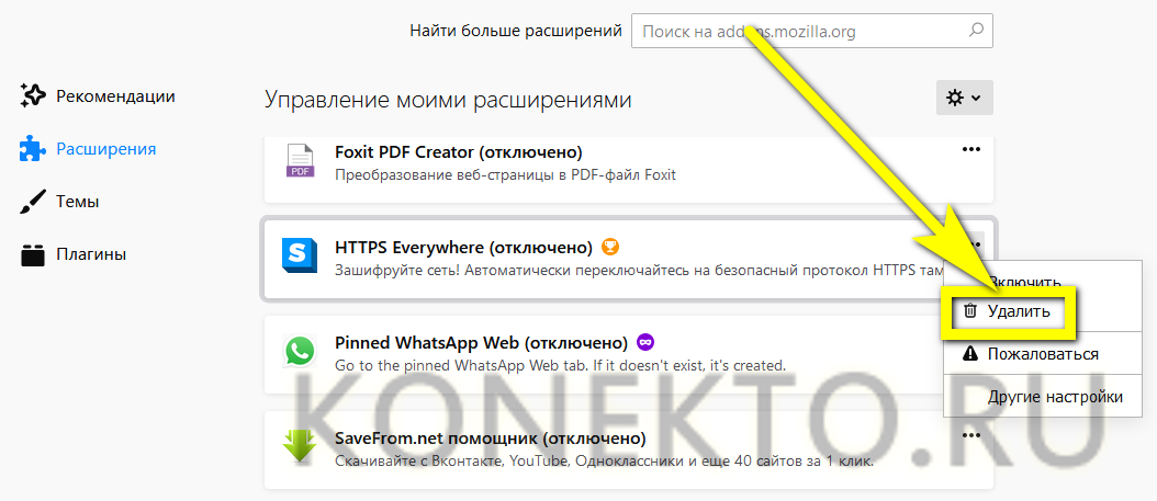 Плагины, надстройки, расширения» Мозила Фаирфокс — это дополнительные программные продукты, служащие для отключения рекламных сообщений, защиты конфиденциальности, обеспечения работы только по протоколу HTTPS или через VPN-сервер. Одним словом, они полезны и обычно проблем не вызывают; однако случиться может всё — нельзя исключать, что причиной сообщения «Ваше соединение не защищено» стал один из установленных плагинов.