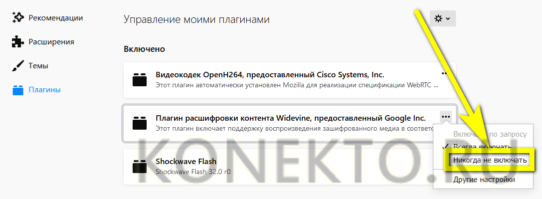 Кроме того, если для расширения предусмотрено собственное диалоговое окно, можно перед отключением и удалением приостановить его работу, передвинув ползунки в положение «Отключено».