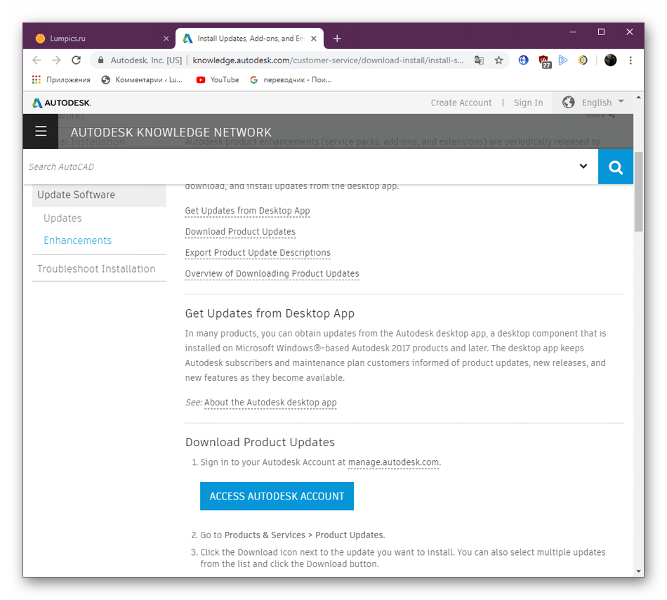 Не всегда получается работать в актуальных версиях AutoCAD либо же пользователь получает чертежи, которые были созданы в устаревших сборках. В любом случае всегда требуется следить за выходом обновлений и устанавливать их, ведь нововведения приносят не только дополнительные функции, они устраняют известные ошибки, в том числе и появляющиеся при сохранении. Перейдите по указанной ниже ссылке на страницу официального сайта Autodesk, где вы получите детальную информацию обо всей процедуре получения обновлений.