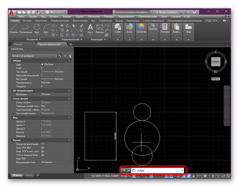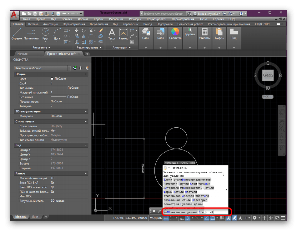 После выполнения действий по расчленению и удалению неразделённых прокси рекомендуется выполнить команду Purge. Она позволяет очистить документ от ненужной информации, например, неиспользуемых блоков, слоёв, текстовых стилей, типов линий и элементов. Если вы просто удалите элементы, то информация о них в программе останется. Например, в списке слоёв они будут отображаться как не содержащие объектов. Чтобы полностью удалить ненужные элементы чертежа выполните следующее: