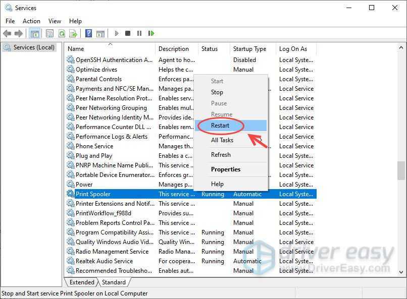 2) Прокрутите вниз, чтобы найти Диспетчер очереди принтера . Щелкните его правой кнопкой мыши и выберите Начать сначала .