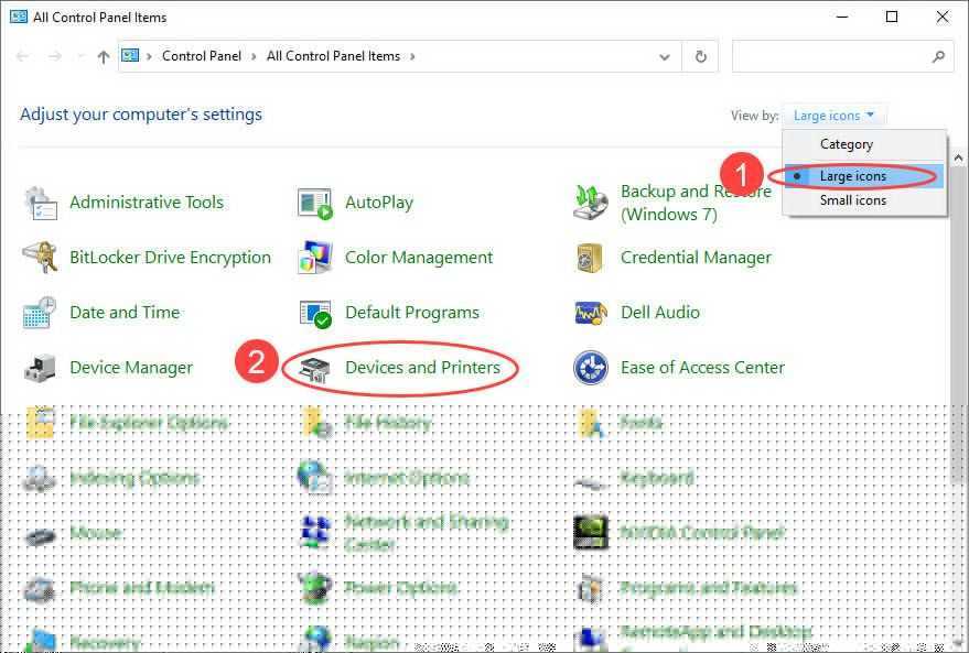 2) Выберите Большие иконки и щелкните Устройство и принтеры .