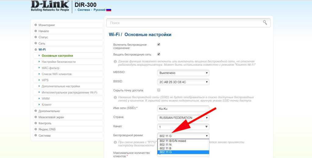 Меняем беспроводной режим в настройках роутера.