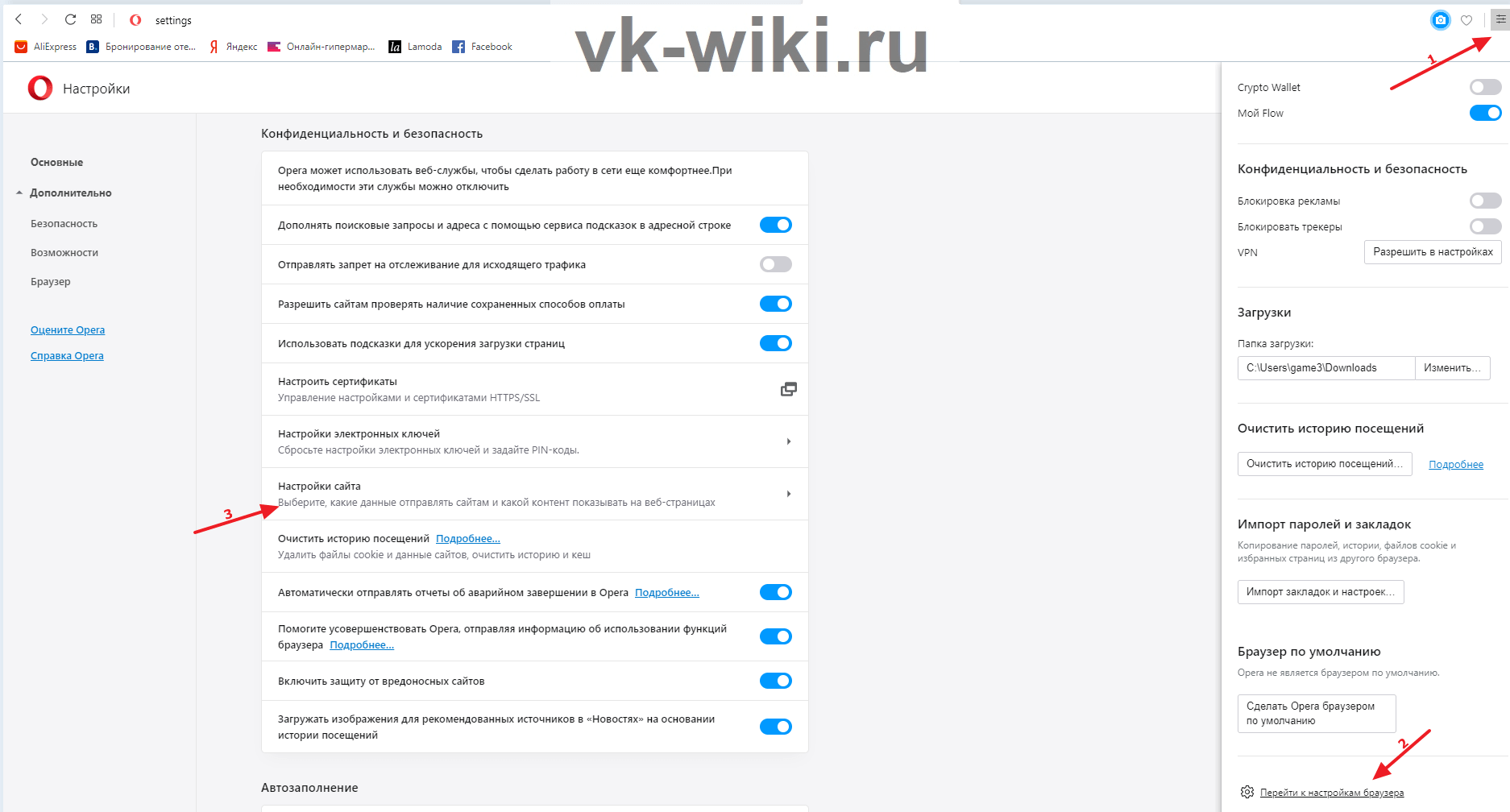 В случае с Opera, здесь сначала нужно кликнуть на кнопку с настройками в правом верхнем углу экрана, чтобы далее в меню с дополнительными функциями снизу выбрать пункт «перейти к настройкам браузера». Далее нужно прокрутить открывшуюся страницу до пункта «Настройки сайта», после чего открыть его для перехода к следующим параметрам.