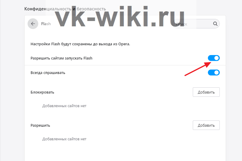 Далее на следующей странице нужно перейти к пункту «Flash», после чего нужно удостовериться в том, что в графе «Разрешить сайтам запускать Flash» переключатель стоит во включенном состоянии. После всех этих действий можно снова проверить, возникает ли ошибка при попытке включения видео «ВКонтакте».