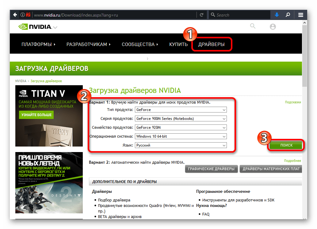 После проверки типа системы возвращаемся на страницу загрузки драйверов видеокарт NVIDIA. Указываем в форме для поиска тип, серию, семейство продуктов, а также операционную систему с подходящей разрядностью — в нашем случае это Windows 10 64-bit