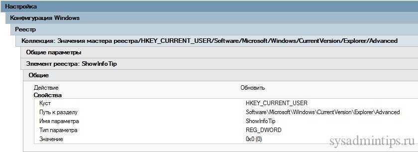 Чуть трудней будет со всплывающими подсказками, так как стандартной настройки в административных шаблонах нет. Нам необходимо добавить следующую информацию в реестр: