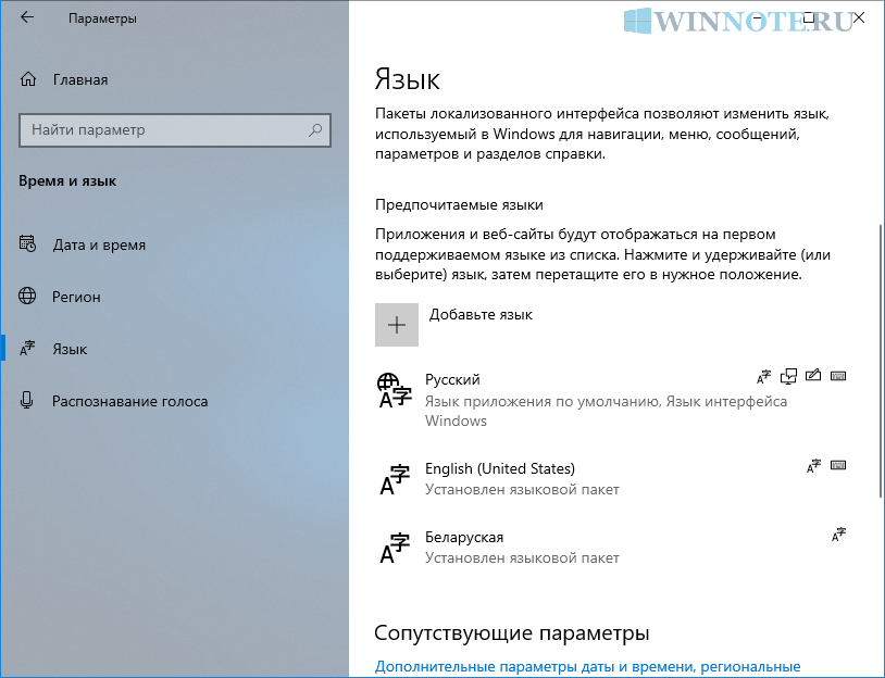 Операционная система Windows 10 доступна на многих языках, и можно установить дополнительные региональные пакеты для каждого из языков. Эта функция позволяет использовать определенный (основной) язык для отображения системного интерфейса (названия приложений, настроек, уведомлений), сохраняя при этом возможность использовать ввод с клавиатуры с помощью дополнительного регионального языка (например белорусский, украинский) для приложений и веб-сайтов.