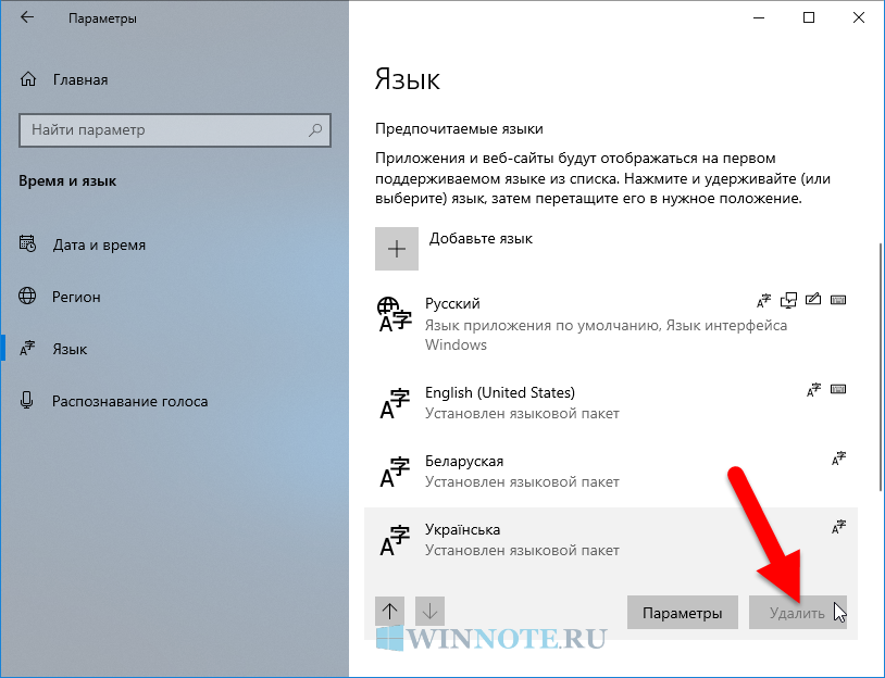 Удалить языковые пакеты в Windows 10
