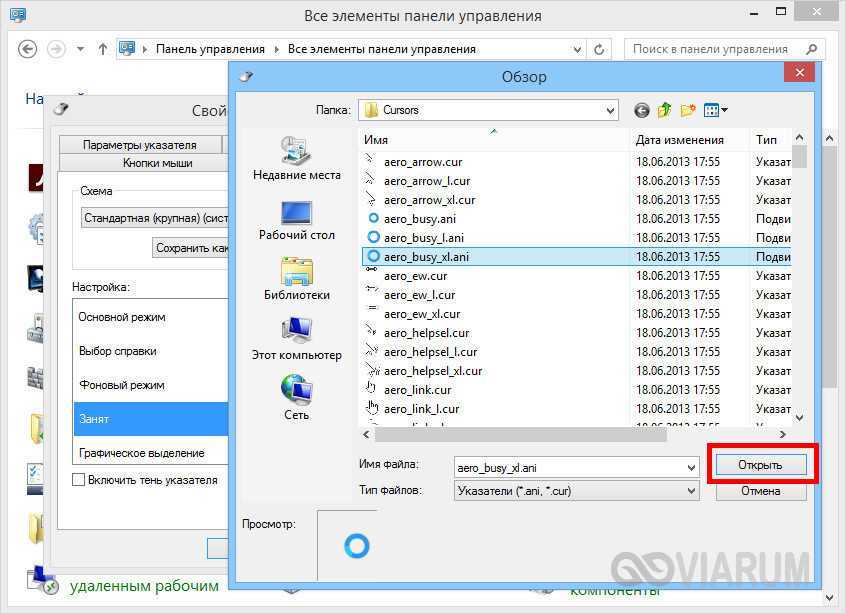 Например, вы выбрали схему «Стандартная крупная системная», но при этом хотите, чтобы вместо песочных часов (состояние «Занят») использовался голубой круг из схемы по умолчанию. Нет ничего проще. Кликните по изменяемому элементу и выберите в открывшемся окне тот курсор, который вам нужен.