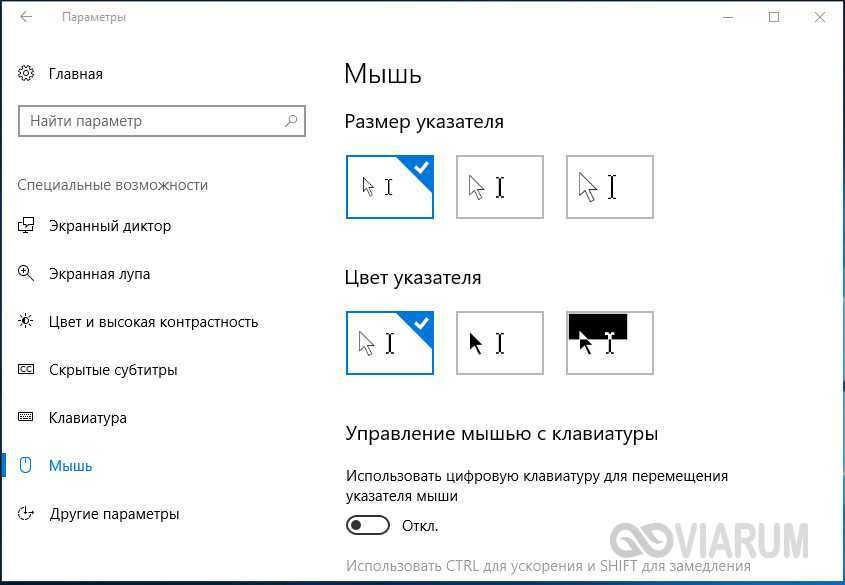 Аналогичным образом настраивается размер и форма курсора в Windows 10, кстати, в этой версии системы попасть в настройки указателя можно из приложения «Параметры», перейдя по цепочке Специальные возможности – Мышь.