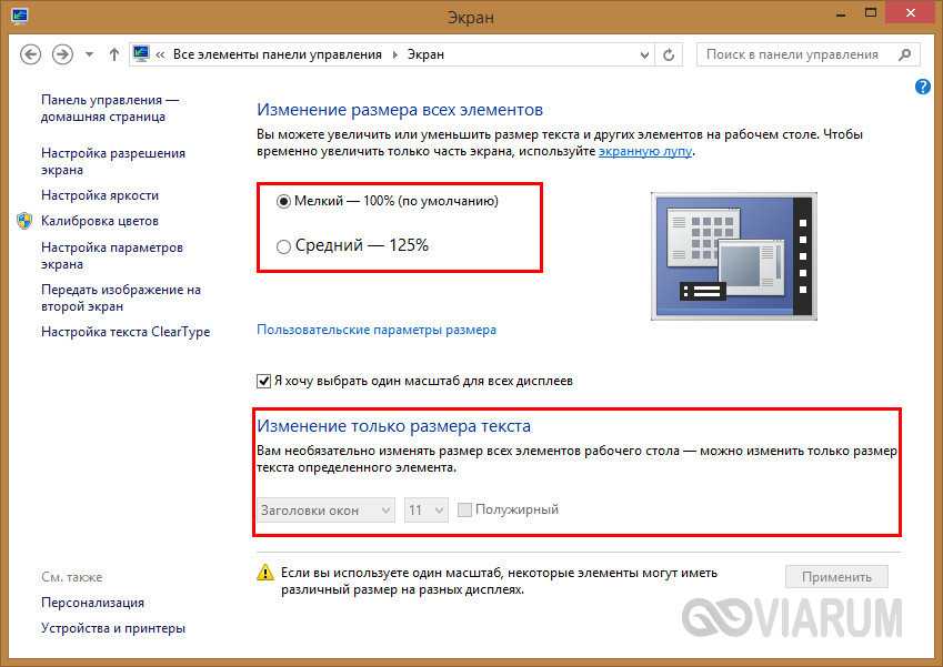 Для этого того чтобы изменить размер, вам придётся воспользоваться одним из существующих способов. Первый достаточно прост, в окне «Экран», который вы только что открывали, будет предложено два варианта шрифта: