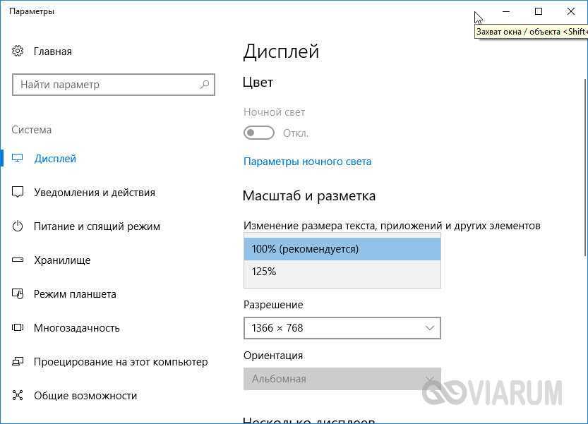 Между масштабированием в Windows 10 и 7/8.1 есть небольшие отличия. Сначала посмотрим, как изменить масштаб экрана на компьютере Windows 10. Для этого откройте приложение «Параметры» и перейдите в раздел «Дисплей», который позволяет задать разрешение и выполнить масштабирование. По умолчанию масштаб выставлен 100%, но в выпадающем меню вы можете выбрать 125%, увеличив тем самым размер всех элементов интерфейса.