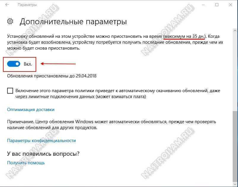 Это стандартный и самый простой способ, позволяющий убрать автоматический поиск и установку обновлений Windows 10. Правда, с оговоркой — на 35 дней максимум. Потом всё вернётся на круги своя. Другими словами, полностью выключить обновления Виндовс этим способом не получится, только на время. Тем не менее, в большинстве случаев, это самый оптимальный вариант — хотя бы раз в месяц пользователь должен всё же уделить время своему компьютеру и выполнить необходимое обслуживание.